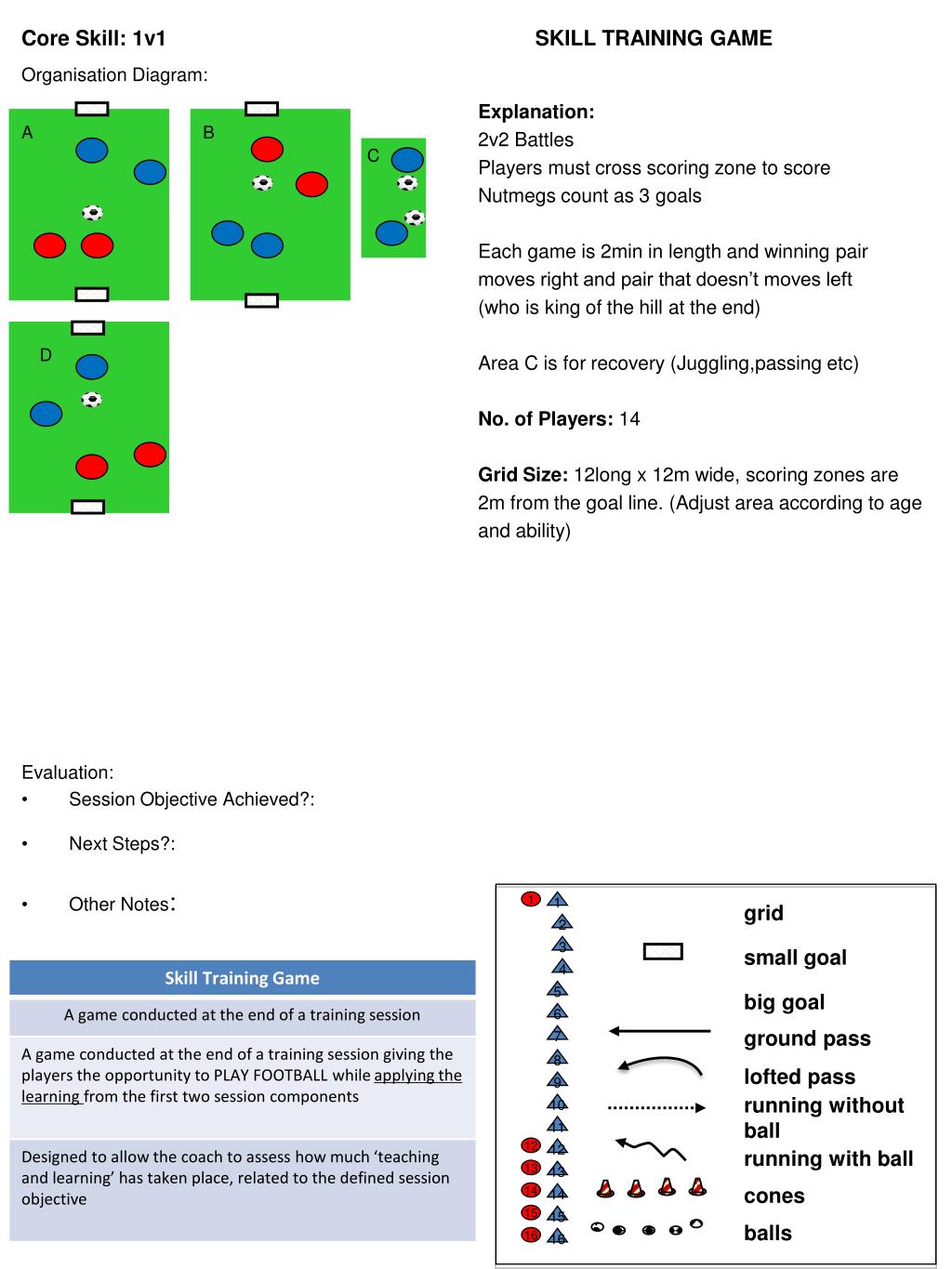 Core Skill: 1v1 SKILL TRAINING GAME Organisation Diagram: A B C Explanation: 2v2 Battles Players must cross scoring zone to score Nutmegs count as 3 goals Each game is 2min in length and winning pair moves right and pair that doesn’t moves left (who is king of the hill at the end) Area C is for recovery (Juggling,passing etc) No. of Players: 14 Grid Size: 12long x 12m wide, scoring zones are 2m from the goal line. (Adjust area according to age and ability) Evaluation: Session Objective Achieved?: Next Steps?: Other Notes: D 1 1 grid 2 3 small goal 4 5 big goal 6 ground pass 7 8 lofted pass 9 running without ball 10 11 12 running with ball 12 13 13 cones 14 14 15 15 balls 16 16
