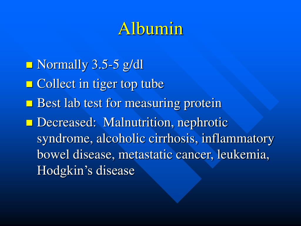 Albumin • Normally 3.5-5 g/dl • Collect in tiger top tube • Best lab test for measuring protein • Decreased: Malnutrition, nephrotic syndrome, alcoholic cirrhosis, inflammatory bowel disease, metastatic cancer, leukemia, Hodgkin’s disease