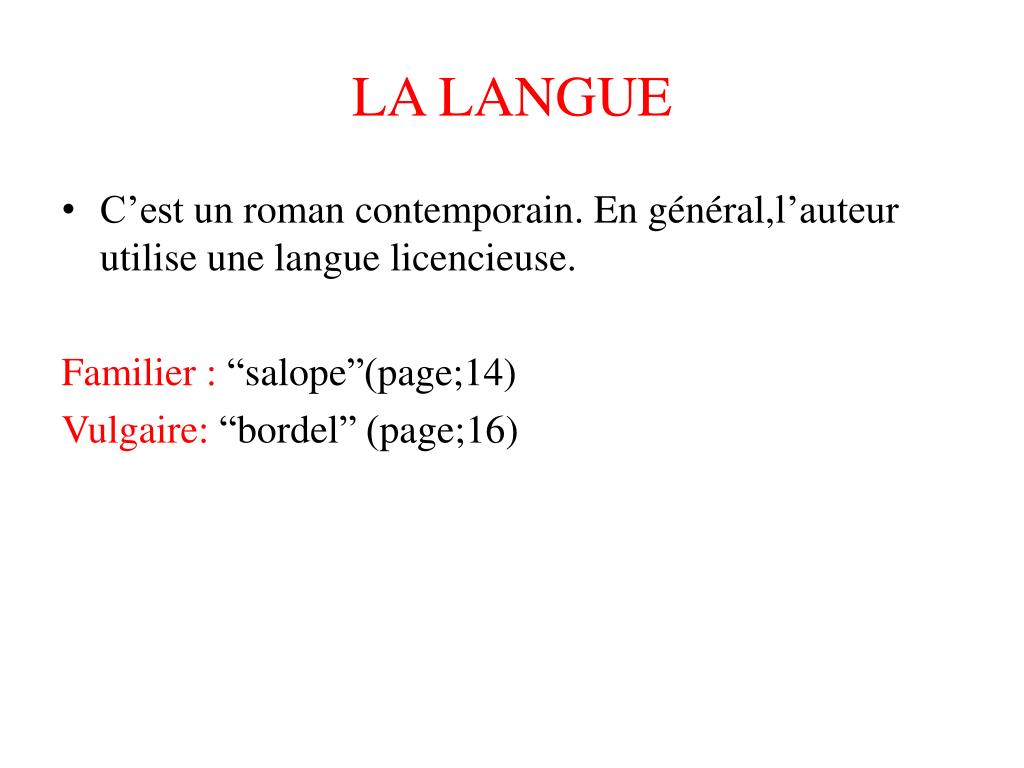 LA LANGUE • C’est un roman contemporain. En général,l’auteurutiliseunelanguelicencieuse. Familier : “salope”(page;14) Vulgaire: “bordel” (page;16)