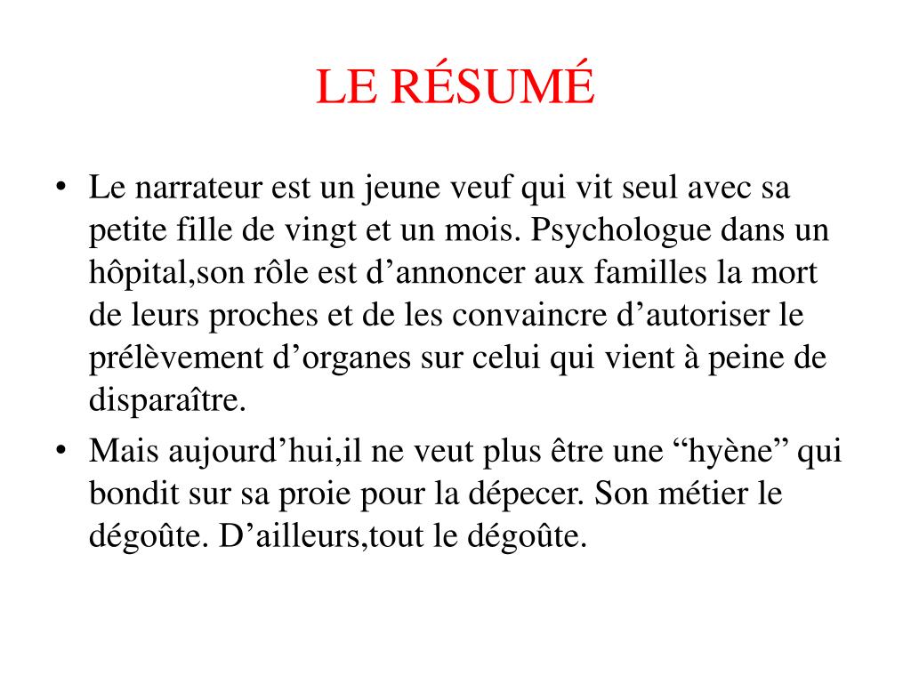LE RÉSUMÉ • Lenarrateurest un jeuneveufquivitseulavecsapetite fille de vingt et un mois. Psychologue dans un hôpital,son rôleestd’annoncerauxfamilles la mort de leursproches et de lesconvaincred’autoriserleprélèvementd’organes sur celuiquivient à peine de disparaître. • Maisaujourd’hui,il ne veutplusêtreune “hyène” quibondit sur saproiepour la dépecer. Son métierledégoûte. D’ailleurs,toutledégoûte.