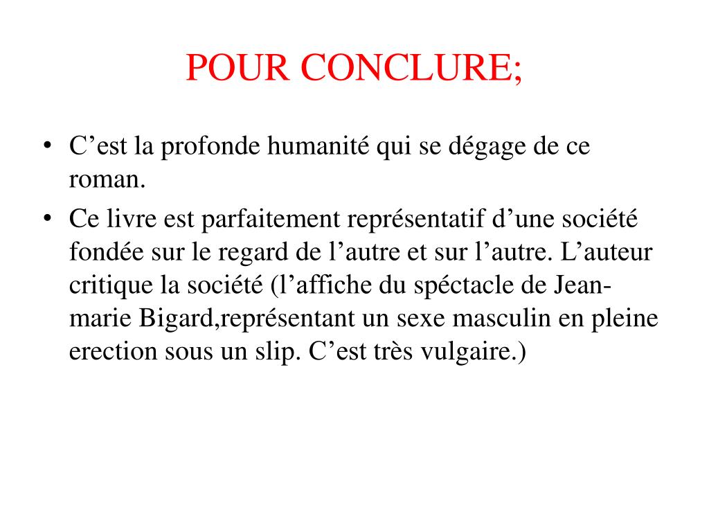 POUR CONCLURE; • C’est la profondehumanitéquisedégage de ce roman. • Celivreestparfaitementreprésentatifd’unesociétéfondée sur leregard de l’autre et sur l’autre. L’auteurcritique la société (l’afficheduspéctacle de Jean-marieBigard,représentant un sexemasculin en pleineerectionsous un slip. C’esttrèsvulgaire.)