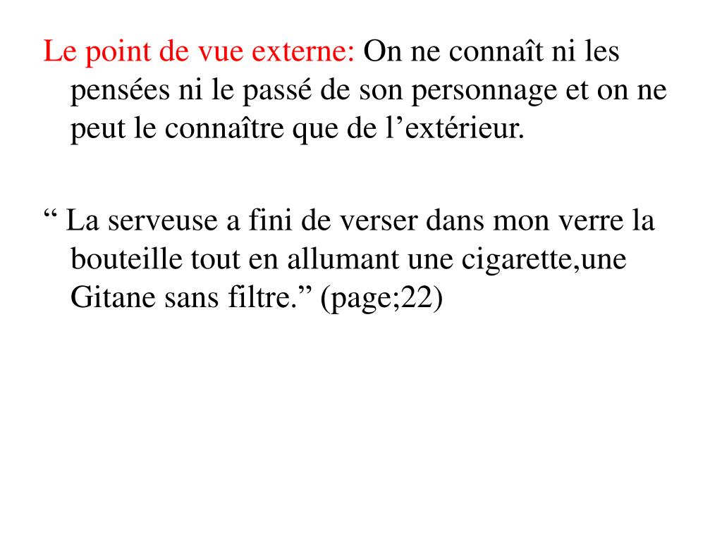 Lepoint de vueexterne: On ne connaîtnilespenséesnilepassé de son personnage et on ne peutleconnaîtreque de l’extérieur. “ La serveuse a fini de verser dans monverre la bouteilletout en allumantunecigarette,uneGitanesans filtre.” (page;22)