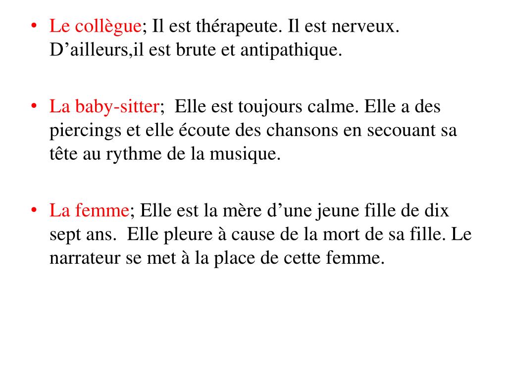 Lecollègue; Ilestthérapeute. Ilestnerveux. D’ailleurs,il estbrute et antipathique. • La baby-sitter; Elle esttoujourscalme. Elle a despiercings et elle écoutedeschansons en secouantsatêteaurythme de la musique. • La femme; Elle est la mèred’unejeune fille de dixseptans. Elle pleure à cause de la mort de sa fille. Lenarrateurse met à la place de cette femme.