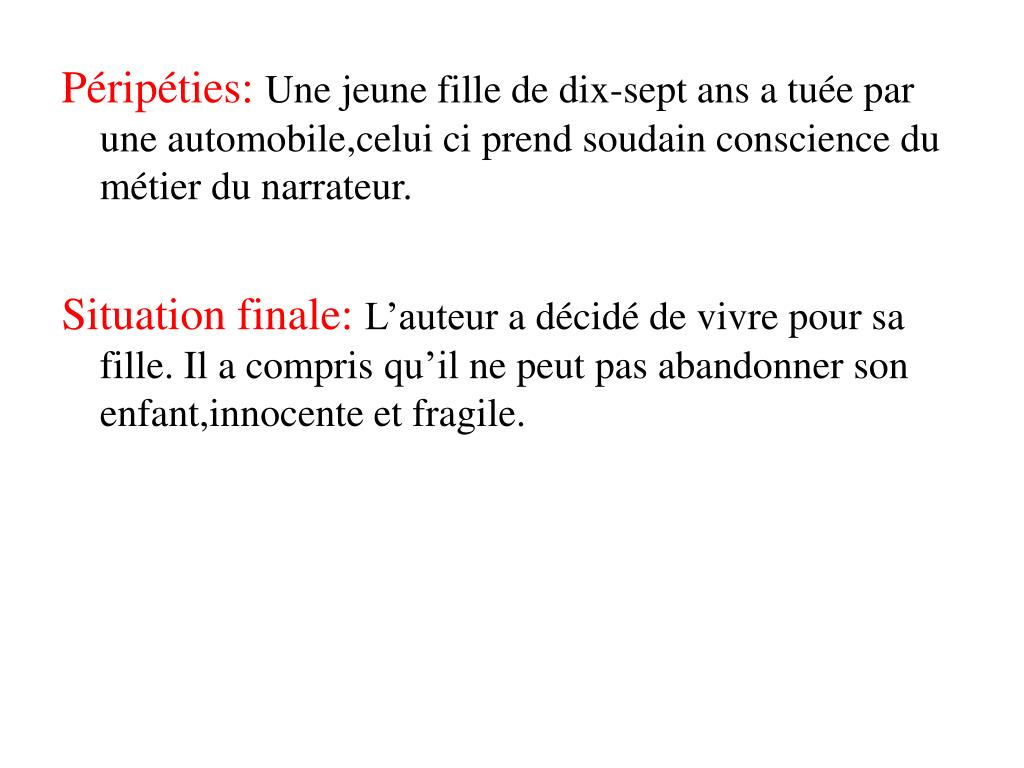 Péripéties: Unejeune fille de dix-septans a tuée par uneautomobile,celuiciprendsoudainconsciencedumétierdunarrateur. Situation finale: L’auteur a décidé de vivrepoursa fille. Il a comprisqu’il ne peut pas abandonner son enfant,innocente et fragile.