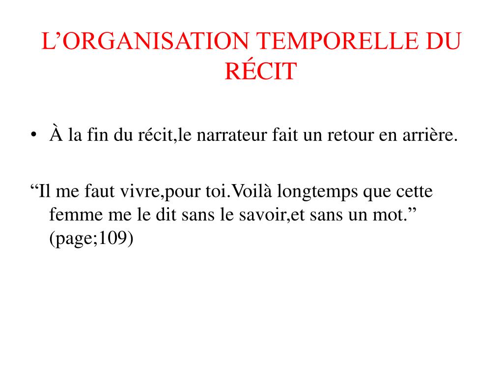 L’ORGANISATION TEMPORELLE DU RÉCIT • À la findurécit,lenarrateurfait un retour en arrière. “Ilmefautvivre,pourtoi.Voilàlongtempsque cette femmemele dit sanslesavoir,et sans un mot.” (page;109)