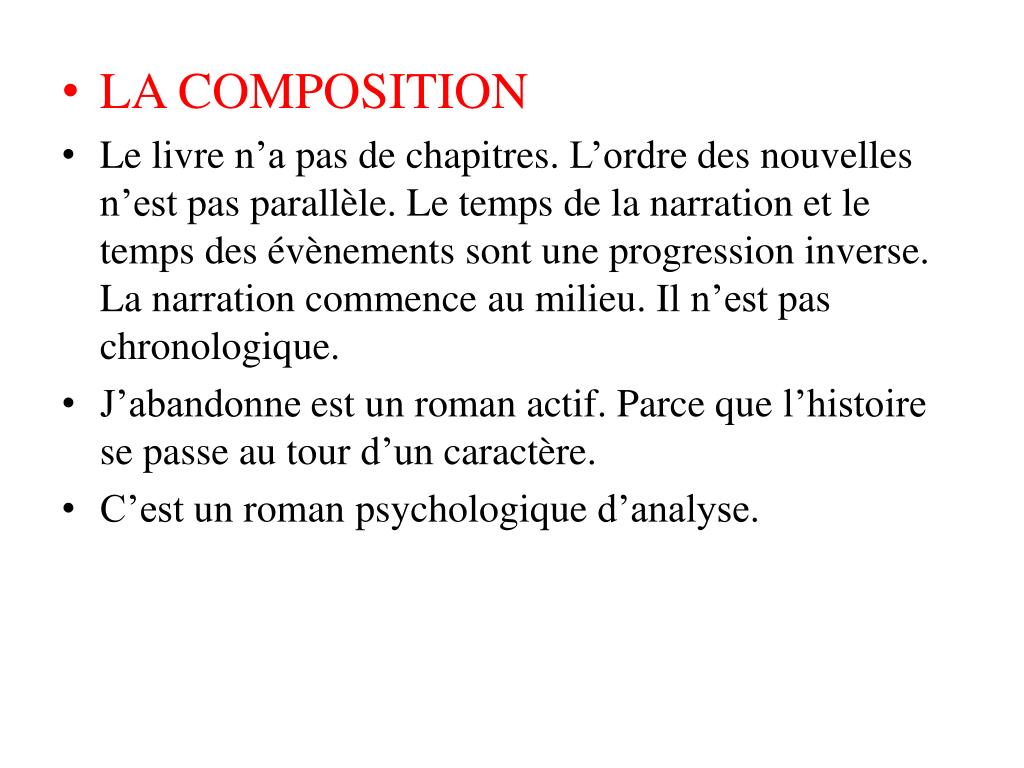 LA COMPOSITION • Lelivren’a pas de chapitres. L’ordredesnouvellesn’est pas parallèle. Letemps de la narration et letempsdesévènementssontuneprogressioninverse. La narrationcommenceaumilieu. Iln’est pas chronologique. • J’abandonneest un roman actif. Parcequel’histoiresepasseautourd’uncaractère. • C’est un roman psychologiqued’analyse.
