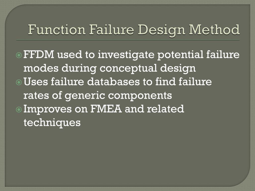 Function Failure Design Method FFDM used to investigate potential failure modes during conceptual design Uses failure databases to find failure rates of generic components Improves on FMEA and related techniques