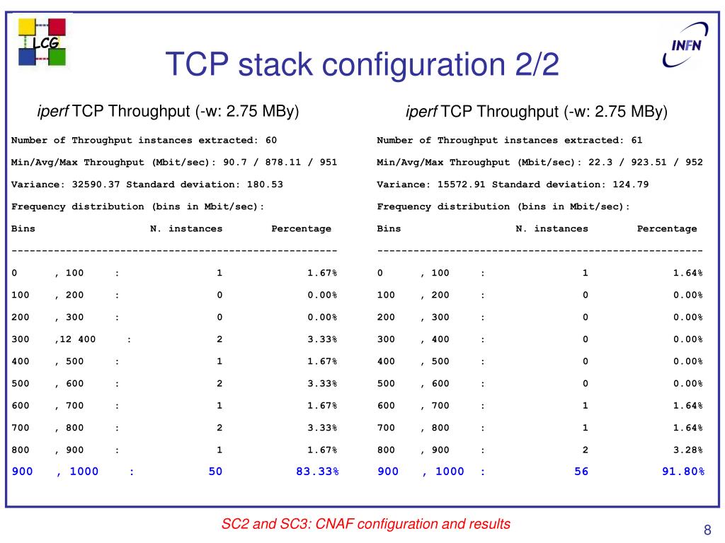 TCP stack configuration 2/2 iperf TCP Throughput (-w: 2.75 MBy) iperf TCP Throughput (-w: 2.75 MBy) Number of Throughput instances extracted: 60 Min/Avg/Max Throughput (Mbit/sec): 90.7 / 878.11 / 951 Variance: 32590.37 Standard deviation: 180.53 Frequency distribution (bins in Mbit/sec): Bins N. instances Percentage ------------------------------------------------------ 0 , 100 : 1 1.67% 100 , 200 : 0 0.00% 200 , 300 : 0 0.00% 300 ,12 400 : 2 3.33% 400 , 500 : 1 1.67% 500 , 600 : 2 3.33% 600 , 700 : 1 1.67% 700 , 800 : 2 3.33% 800 , 900 : 1 1.67% 900 , 1000 : 50 83.33% Number of Throughput instances extracted: 61 Min/Avg/Max Throughput (Mbit/sec): 22.3 / 923.51 / 952 Variance: 15572.91 Standard deviation: 124.79 Frequency distribution (bins in Mbit/sec): Bins N. instances Percentage ------------------------------------------------------ 0 , 100 : 1 1.64% 100 , 200 : 0 0.00% 200 , 300 : 0 0.00% 300 , 400 : 0 0.00% 400 , 500 : 0 0.00% 500 , 600 : 0 0.00% 600 , 700 : 1 1.64% 700 , 800 : 1 1.64% 800 , 900 : 2 3.28% 900 , 1000 : 56 91.80% SC2 and SC3: CNAF configuration and results