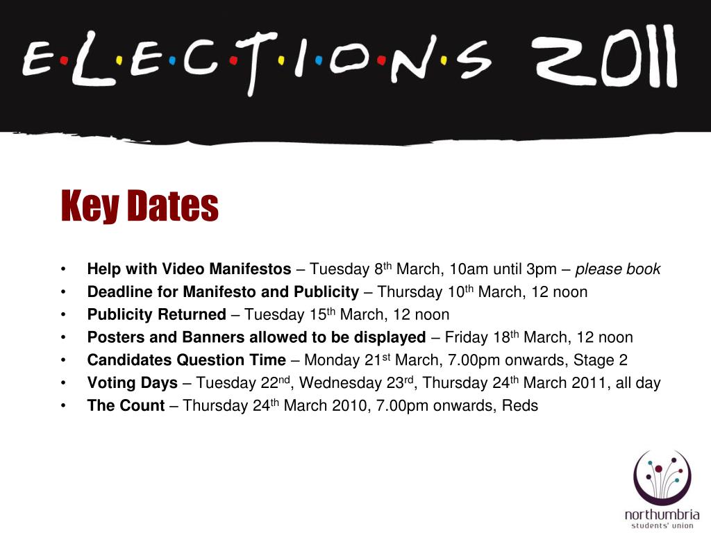 Key Dates • Help with Video Manifestos – Tuesday 8th March, 10am until 3pm – please book • Deadline for Manifesto and Publicity – Thursday 10th March, 12 noon • Publicity Returned – Tuesday 15th March, 12 noon • Posters and Banners allowed to be displayed – Friday 18th March, 12 noon • Candidates Question Time – Monday 21st March, 7.00pm onwards, Stage 2 • Voting Days – Tuesday 22nd, Wednesday 23rd, Thursday 24th March 2011, all day • The Count – Thursday 24th March 2010, 7.00pm onwards, Reds
