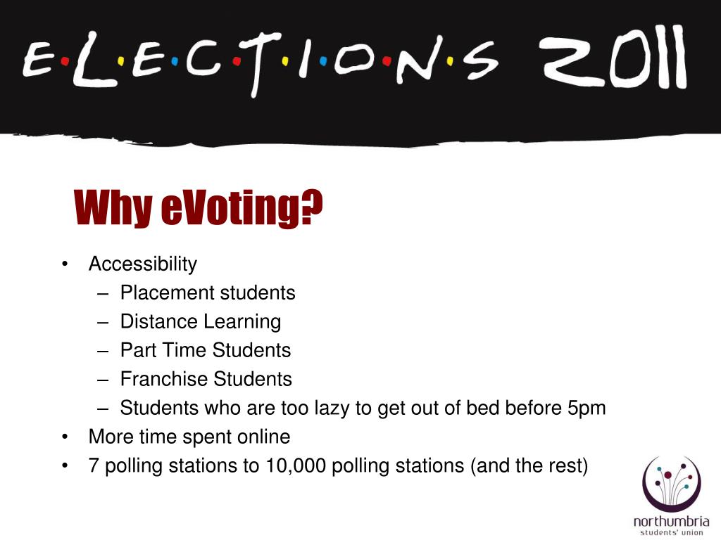 Why eVoting? • Accessibility • Placement students • Distance Learning • Part Time Students • Franchise Students • Students who are too lazy to get out of bed before 5pm • More time spent online • 7 polling stations to 10,000 polling stations (and the rest)
