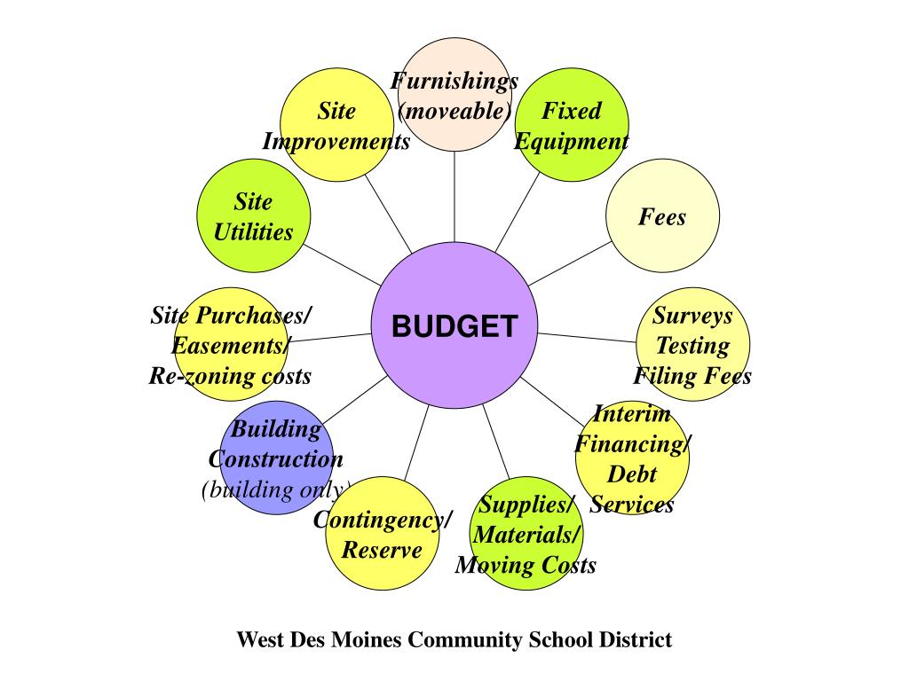 Furnishings (moveable) Site Improvements Fixed Equipment Site Utilities Fees Site Purchases/ Easements/ Re-zoning costs Surveys Testing Filing Fees Building Construction (building only) Interim Financing/ Debt Services Contingency/ Reserve Supplies/ Materials/ Moving Costs BUDGET West Des Moines Community School District