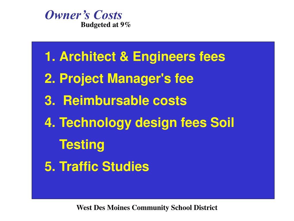 Owner’s Costs Budgeted at 9% • Architect & Engineers fees • Project Manager's fee • Reimbursable costs • Technology design fees Soil Testing • Traffic Studies West Des Moines Community School District