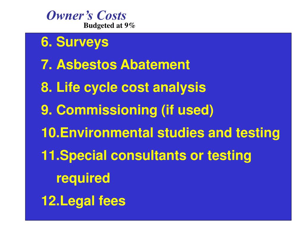 Owner’s Costs Budgeted at 9% • Surveys • Asbestos Abatement • Life cycle cost analysis • Commissioning (if used) • Environmental studies and testing • Special consultants or testing required • Legal fees
