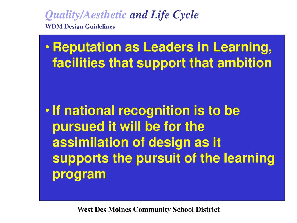 Quality/Aesthetic and Life Cycle WDM Design Guidelines • Reputation as Leaders in Learning, facilities that support that ambition • If national recognition is to be pursued it will be for the assimilation of design as it supports the pursuit of the learning program West Des Moines Community School District