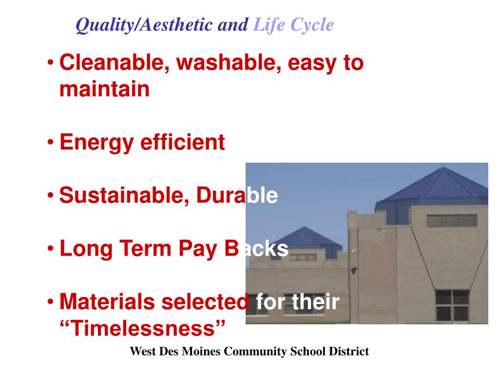 Quality/Aesthetic and Life Cycle • Cleanable, washable, easy to maintain • Energy efficient • Sustainable, Durable • Long Term Pay Backs • Materials selected for their “Timelessness” West Des Moines Community School District