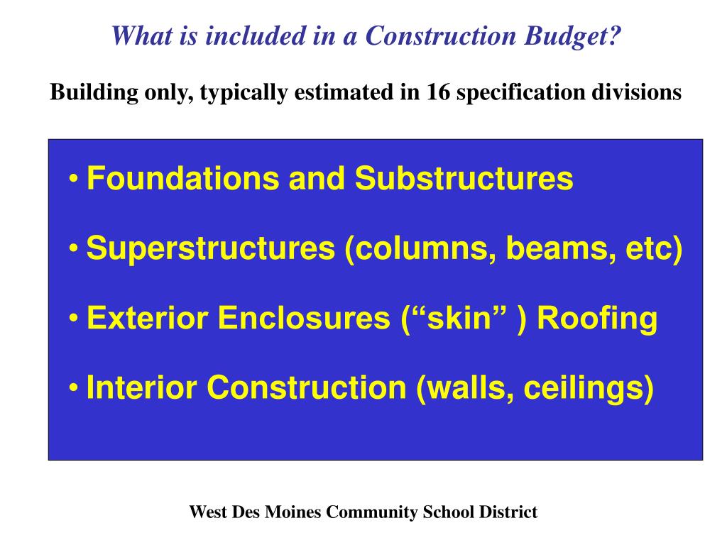 What is included in a Construction Budget? Building only, typically estimated in 16 specification divisions • Foundations and Substructures • Superstructures (columns, beams, etc) • Exterior Enclosures (“skin” ) Roofing • Interior Construction (walls, ceilings) West Des Moines Community School District