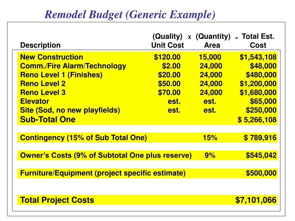 Remodel Budget (Generic Example) (Quality) (Quantity) Total Est. Description Unit Cost Area Cost X = New Construction $120.00 15,000 $1,543,108 Comm./Fire Alarm/Technology $2.00 24,000 $48,000 Reno Level 1 (Finishes) $20.00 24,000 $480,000 Reno Level 2 $50.00 24,000 $1,200,000 Reno Level 3 $70.00 24,000 $1,680,000 Elevator est. est. $65,000 Site (Sod, no new playfields) est. est. $250,000 Sub-Total One $ 5,266,108 Contingency (15% of Sub Total One) 15% $ 789,916 Owner’s Costs (9% of Subtotal One plus reserve) 9% $545,042 Furniture/Equipment (project specific estimate) $500,000 Total Project Costs$7,101,066