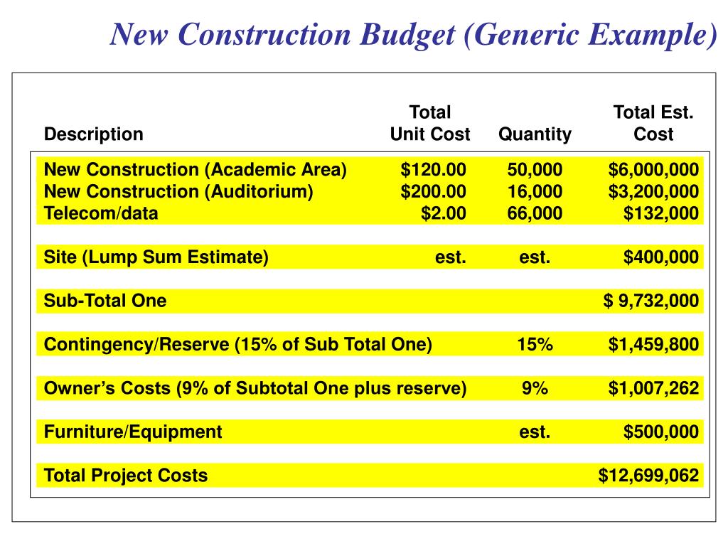 What is included in a Construction Budget? Building only, typically estimated in 16 specification divisions • Conveying (elevators, equipment) • Mechanical • Electrical • Specialties (“chalk” boards, etc.) • Contractors costs (Mgmt., Gen. Cond.)