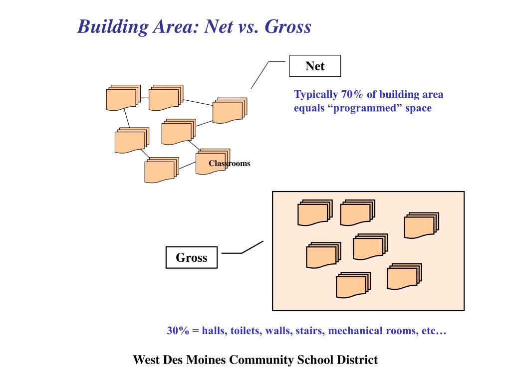 Net Gross Building Area: Net vs. Gross Typically 70% of building area equals “programmed” space Classrooms 30% = halls, toilets, walls, stairs, mechanical rooms, etc… West Des Moines Community School District