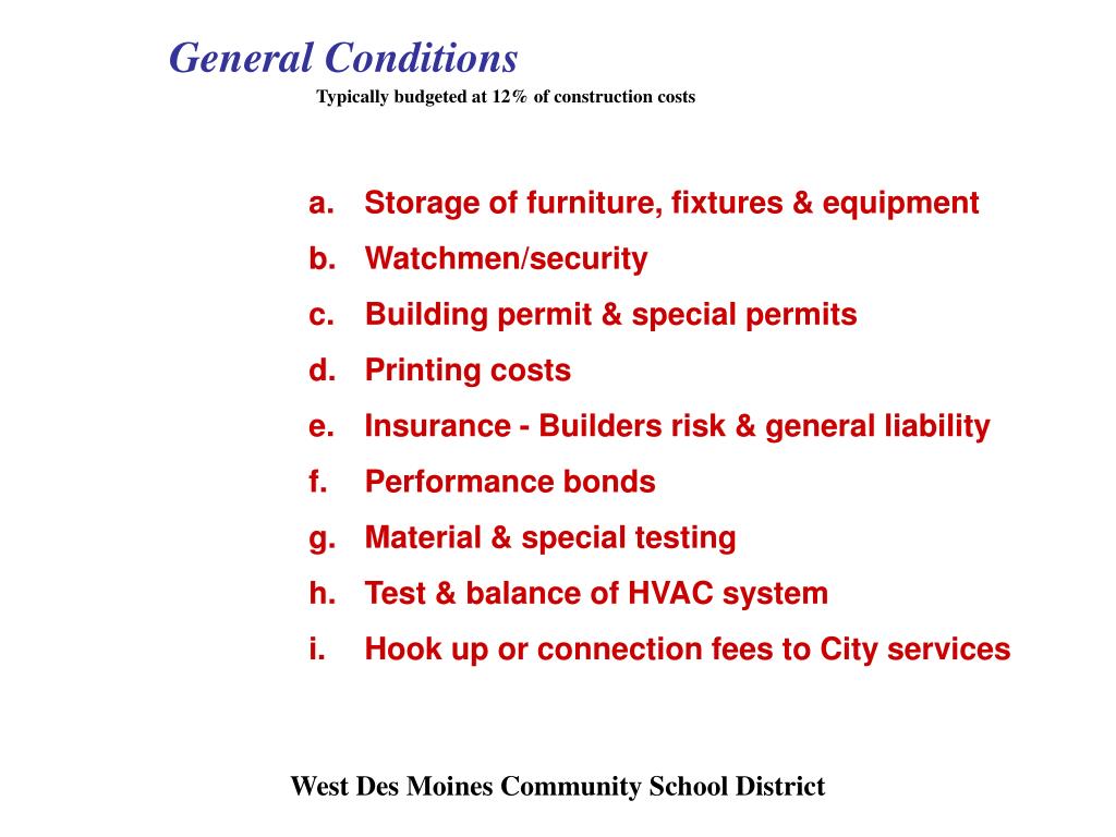 General Conditions Typically budgeted at 12% of construction costs • Storage of furniture, fixtures & equipment • Watchmen/security • Building permit & special permits • Printing costs • Insurance - Builders risk & general liability • Performance bonds • Material & special testing • Test & balance of HVAC system • Hook up or connection fees to City services • Storage of furniture, fixtures & equipment • Watchmen/security • Building permit & special permits • Printing costs • Insurance - Builders risk & general liability • Performance bonds • Material & special testing • Test & balance of HVAC system • Hook up or connection fees to City services West Des Moines Community School District