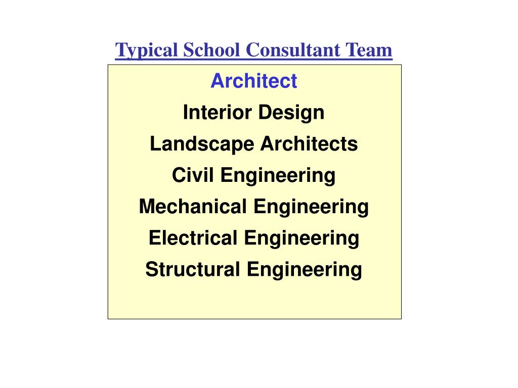 Typical School Consultant Team Architect Interior Design Landscape Architects Civil Engineering Mechanical Engineering Electrical Engineering Structural Engineering