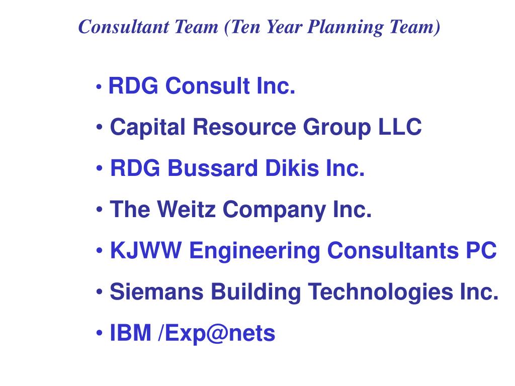 Consultant Team (Ten Year Planning Team) • RDG Consult Inc. • Capital Resource Group LLC • RDG Bussard Dikis Inc. • The Weitz Company Inc. • KJWW Engineering Consultants PC • Siemans Building Technologies Inc. • IBM /Exp@nets