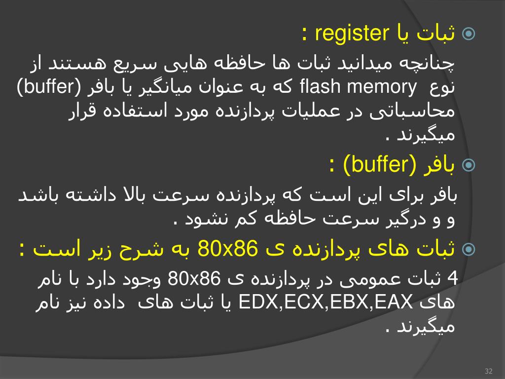 ثبات یا register: چنانچه میدانید ثبات ها حافظه هایی سریع هستند از نوع flash memory که به عنوان میانگیر یا بافر (buffer) محاسباتی در عملیات پردازنده مورد استفاده قرار میگیرند . • بافر (buffer) : بافر برای این است که پردازنده سرعت بالا داشته باشد و و درگیر سرعت حافظه کم نشود . • ثبات های پردازنده ی 80x86 به شرح زیر است : 4 ثبات عمومی در پردازنده ی 80x86 وجود دارد با نام های EDX,ECX,EBX,EAX یا ثبات های داده نیز نام میگیرند .