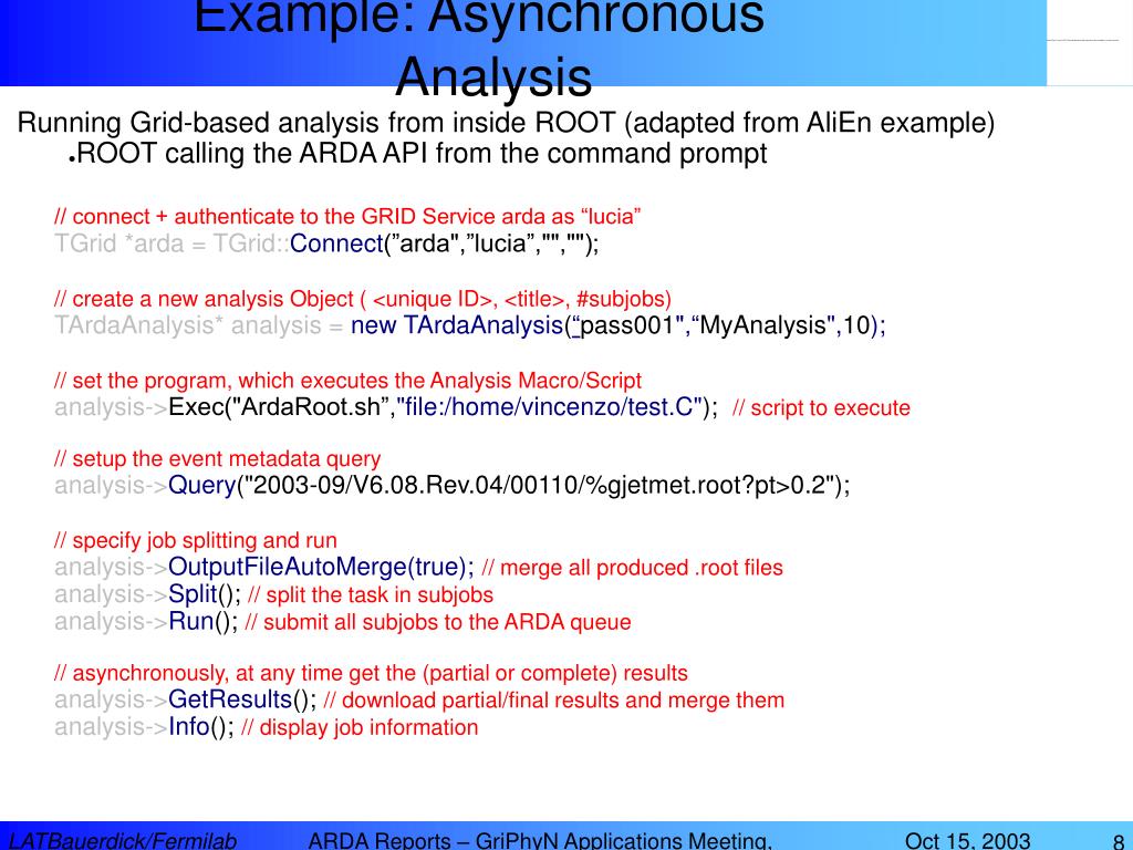 Example: Asynchronous Analysis Running Grid-based analysis from inside ROOT (adapted from AliEn example) • ROOT calling the ARDA API from the command prompt // connect + authenticate to the GRID Service arda as “lucia” TGrid *arda = TGrid::Connect(”arda",”lucia”,"",""); // create a new analysis Object ( <unique ID>, <title>, #subjobs) TArdaAnalysis* analysis =new TArdaAnalysis(“pass001",“MyAnalysis",10); // set the program, which executes the Analysis Macro/Script analysis->Exec("ArdaRoot.sh”,"file:/home/vincenzo/test.C"); // script to execute // setup the event metadata query analysis->Query("2003-09/V6.08.Rev.04/00110/%gjetmet.root?pt>0.2"); // specify job splitting and run analysis->OutputFileAutoMerge(true); // merge all produced .root files analysis->Split(); // split the task in subjobs analysis->Run(); // submit all subjobs to the ARDA queue // asynchronously, at any time get the (partial or complete) results analysis->GetResults(); // download partial/final results and merge them analysis->Info(); // display job information
