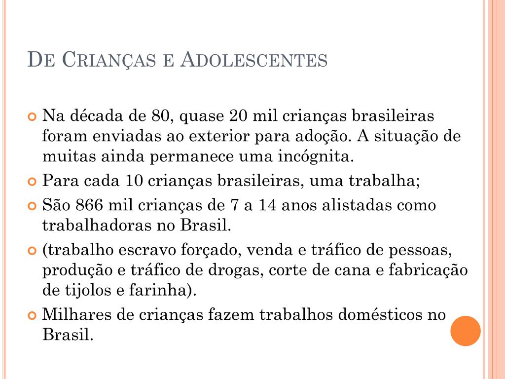 De Crianças e Adolescentes • Na década de 80, quase 20 mil crianças brasileiras foram enviadas ao exterior para adoção. A situação de muitas ainda permanece uma incógnita. • Para cada 10 crianças brasileiras, uma trabalha; • São 866 mil crianças de 7 a 14 anos alistadas como trabalhadoras no Brasil. • (trabalho escravo forçado, venda e tráfico de pessoas, produção e tráfico de drogas, corte de cana e fabricação de tijolos e farinha). • Milhares de crianças fazem trabalhos domésticos no Brasil.