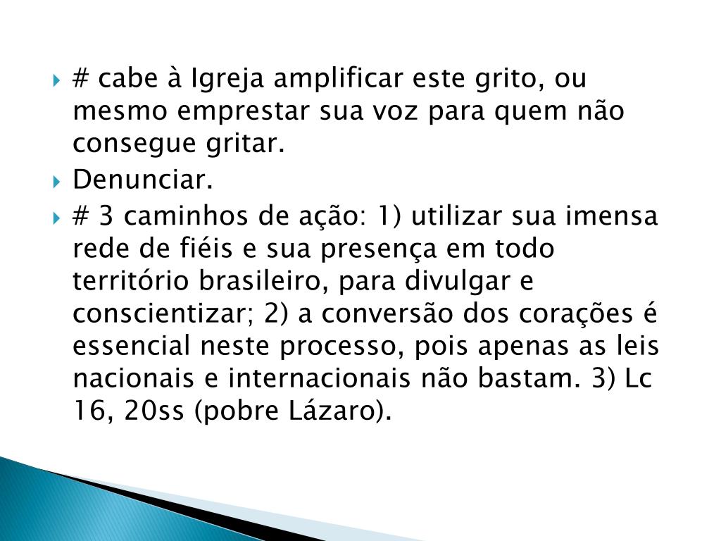 # cabe à Igreja amplificar este grito, ou mesmo emprestar sua voz para quem não consegue gritar. • Denunciar. • # 3 caminhos de ação: 1) utilizar sua imensa rede de fiéis e sua presença em todo território brasileiro, para divulgar e conscientizar; 2) a conversão dos corações é essencial neste processo, pois apenas as leis nacionais e internacionais não bastam. 3) Lc 16, 20ss (pobre Lázaro).