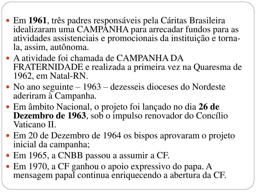 Em 1961, três padres responsáveis pela Cáritas Brasileira idealizaram uma CAMPANHA para arrecadar fundos para as atividades assistenciais e promocionais da instituição e torna-la, assim, autônoma. • A atividade foi chamada de CAMPANHA DA FRATERNIDADE e realizada a primeira vez na Quaresma de 1962, em Natal-RN. • No ano seguinte – 1963 – dezesseis dioceses do Nordeste aderiram à Campanha. • Em âmbito Nacional, o projeto foi lançado no dia 26 de Dezembro de 1963, sob o impulso renovador do Concílio Vaticano II. • Em 20 de Dezembro de 1964 os bispos aprovaram o projeto inicial da campanha; • Em 1965, a CNBB passou a assumir a CF. • Em 1970, a CF ganhou o apoio expressivo do papa. A mensagem papal continua enriquecendo a abertura da CF.