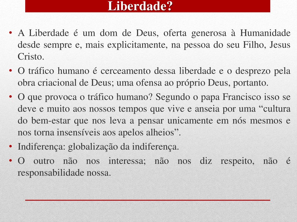 Liberdade? • A Liberdade é um dom de Deus, oferta generosa à Humanidade desde sempre e, mais explicitamente, na pessoa do seu Filho, Jesus Cristo. • O tráfico humano é cerceamento dessa liberdade e o desprezo pela obra criacional de Deus; uma ofensa ao próprio Deus, portanto. • O que provoca o tráfico humano? Segundo o papa Francisco isso se deve e muito aos nossos tempos que vive e anseia por uma “cultura do bem-estar que nos leva a pensar unicamente em nós mesmos e nos torna insensíveis aos apelos alheios”. • Indiferença: globalização da indiferença. • O outro não nos interessa; não nos diz respeito, não é responsabilidade nossa.