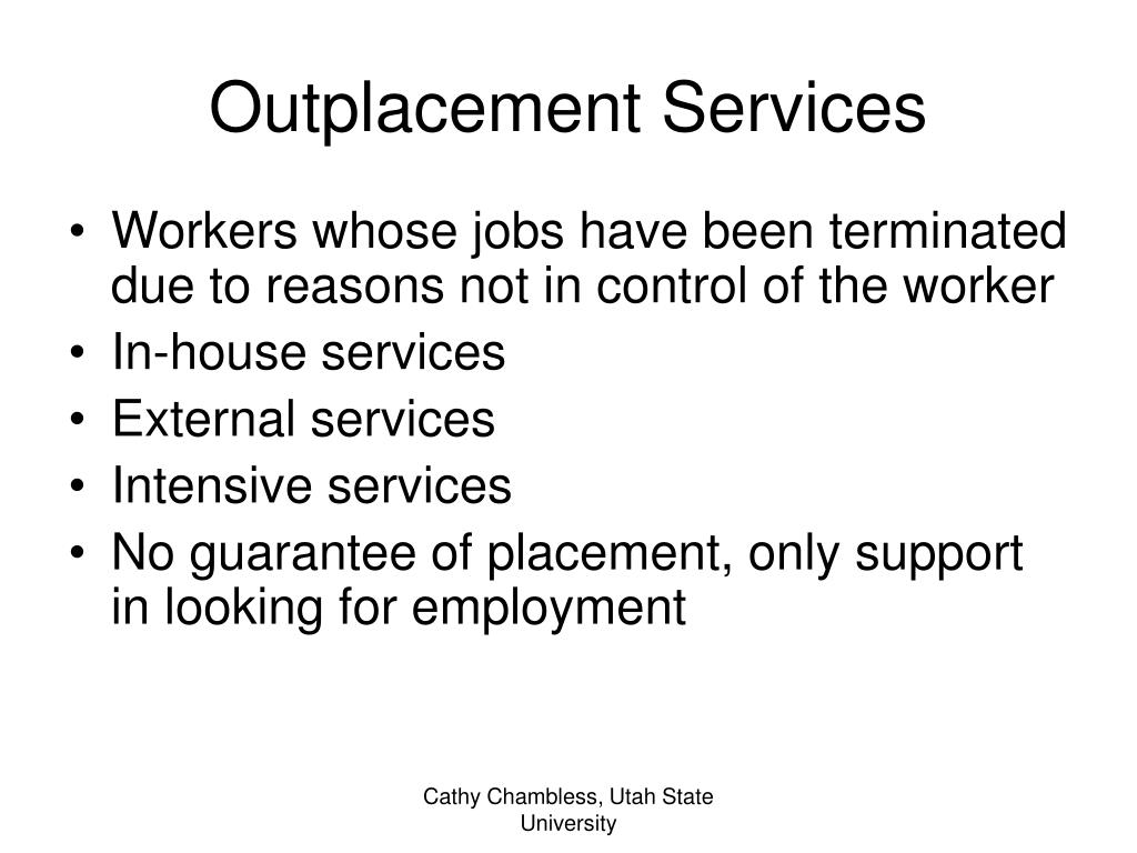 Outplacement Services • Workers whose jobs have been terminated due to reasons not in control of the worker • In-house services • External services • Intensive services • No guarantee of placement, only support in looking for employment Cathy Chambless, Utah State University