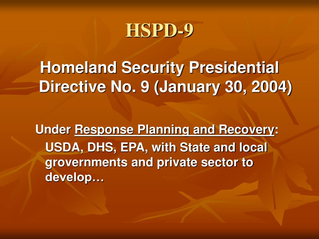 HSPD-9 Homeland Security Presidential Directive No. 9 (January 30, 2004) Under Response Planning and Recovery: USDA, DHS, EPA, with State and local grovernments and private sector to develop…