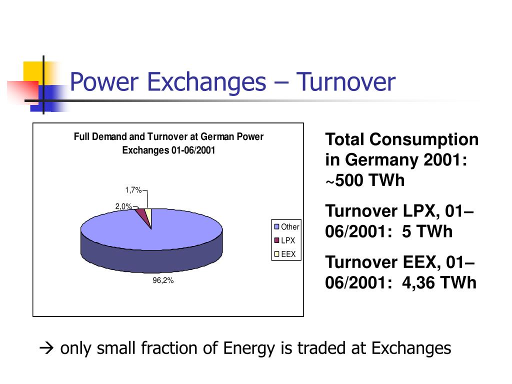 Power Exchanges – Turnover Total Consumption in Germany 2001: ~500 TWh Turnover LPX, 01–06/2001: 5 TWh Turnover EEX, 01–06/2001: 4,36 TWh only small fraction of Energy is traded at Exchanges