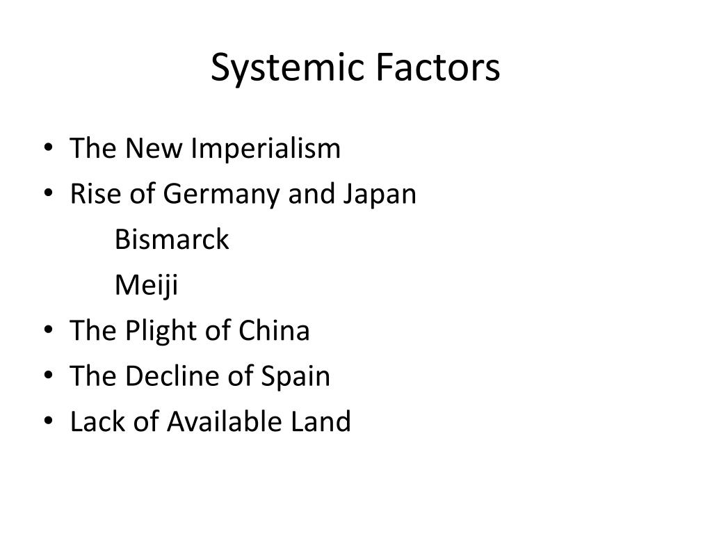 Systemic Factors • The New Imperialism • Rise of Germany and Japan Bismarck Meiji • The Plight of China • The Decline of Spain • Lack of Available Land