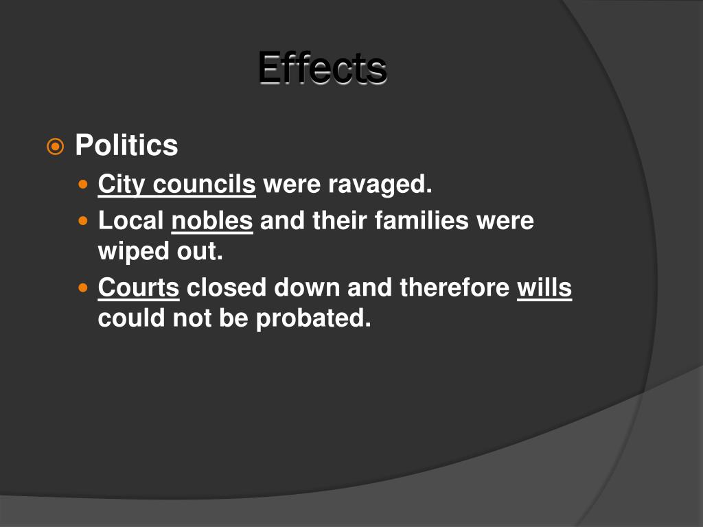 Effects • Politics • City councils were ravaged. • Local nobles and their families were wiped out. • Courts closed down and therefore wills could not be probated.