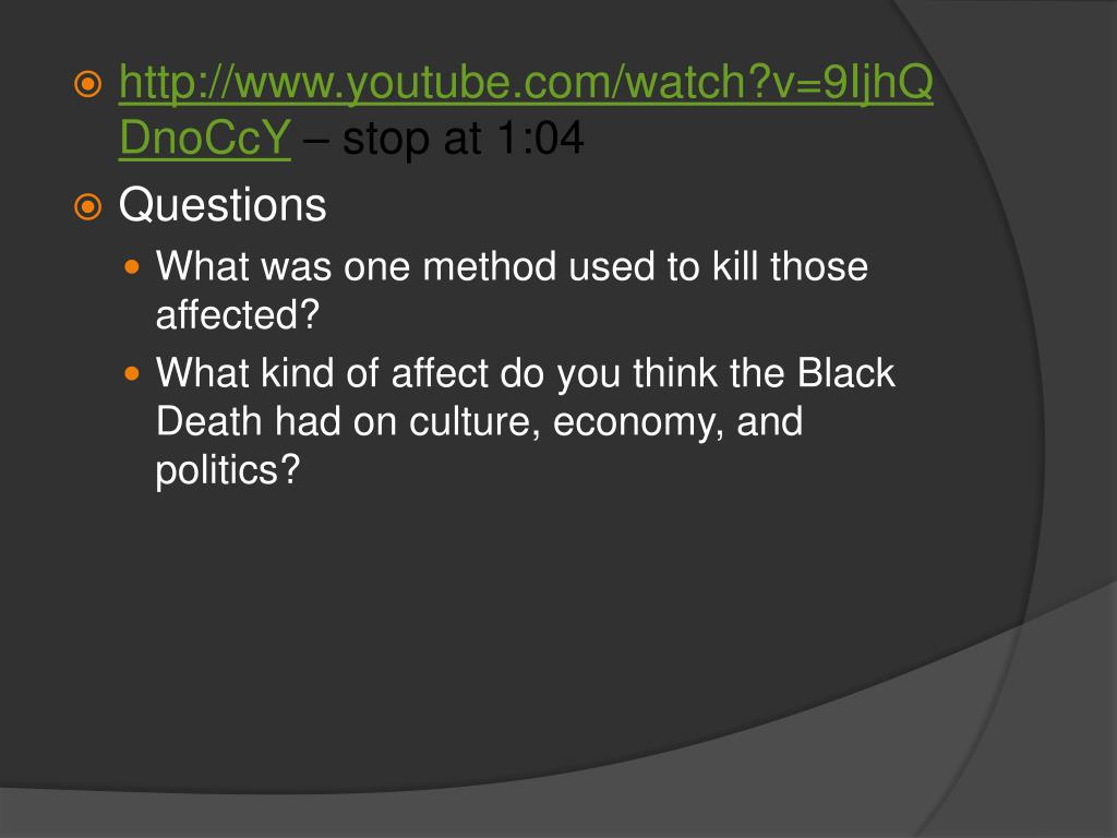 http://www.youtube.com/watch?v=9IjhQDnoCcY– stop at 1:04 • Questions • What was one method used to kill those affected? • What kind of affect do you think the Black Death had on culture, economy, and politics?