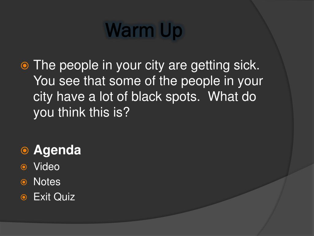 Warm Up • The people in your city are getting sick. You see that some of the people in your city have a lot of black spots. What do you think this is? • Agenda • Video • Notes • Exit Quiz