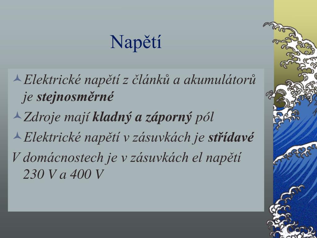 Napětí • Elektrické napětí z článků a akumulátorů je stejnosměrné • Zdroje mají kladný a záporný pól • Elektrické napětí v zásuvkách je střídavé V domácnostech je v zásuvkách el napětí 230 V a 400 V