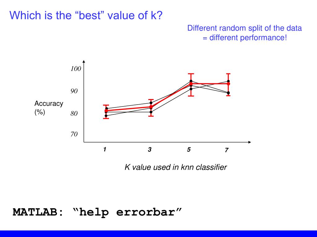 Which is the “best” value of k? Different random split of the data = different performance! 100 90 Accuracy (%) 80 70 1 3 5 7 K value used in knn classifier MATLAB: “help errorbar”