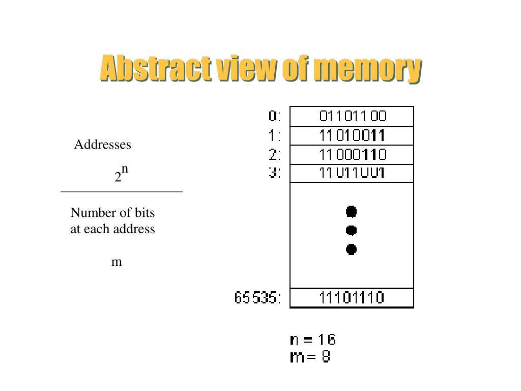 Main Memory • RAM • Random Access Memory that can be read from and written to. Contents are volatile, so contents are lost when power removed • This type of memory is fast. Memories for computers are rated by their capacity in bytes. • ROM • Read Only Memory can only be read from. Contents are non-volatile, so contents are NOT lost when power is removed • Also fast access