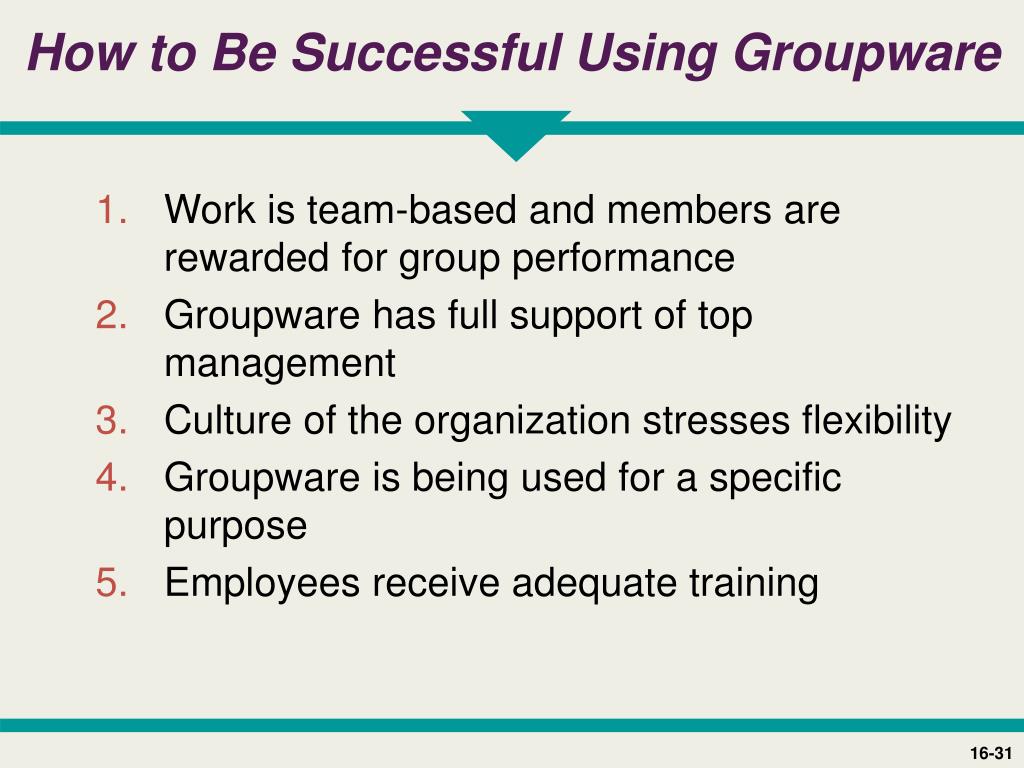 How to Be Successful Using Groupware Work is team-based and members are rewarded for group performance Groupware has full support of top management Culture of the organization stresses flexibility Groupware is being used for a specific purpose Employees receive adequate training