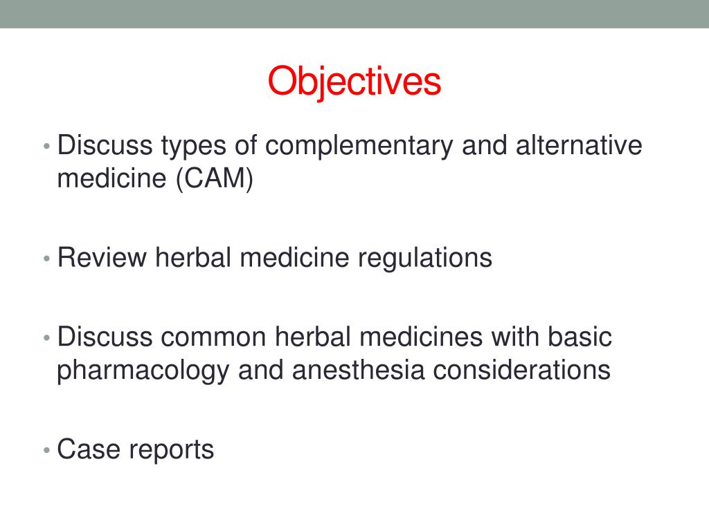 Objectives • Discuss types of complementary and alternative medicine (CAM) • Review herbal medicine regulations • Discuss common herbal medicines with basic pharmacology and anesthesia considerations • Case reports