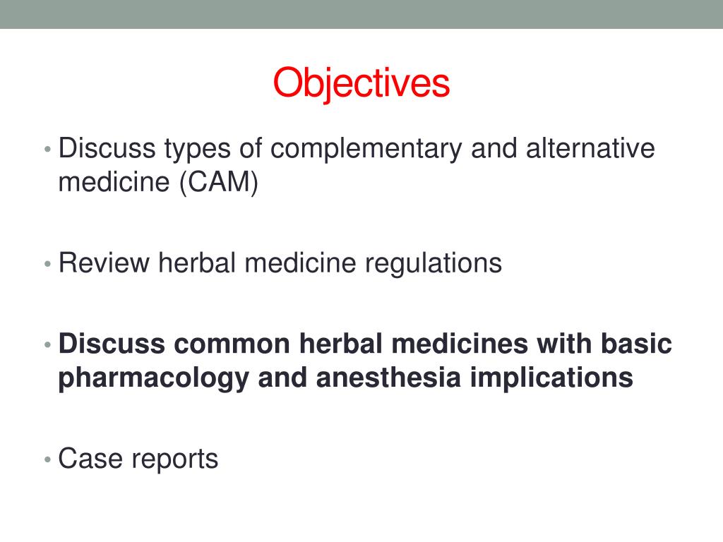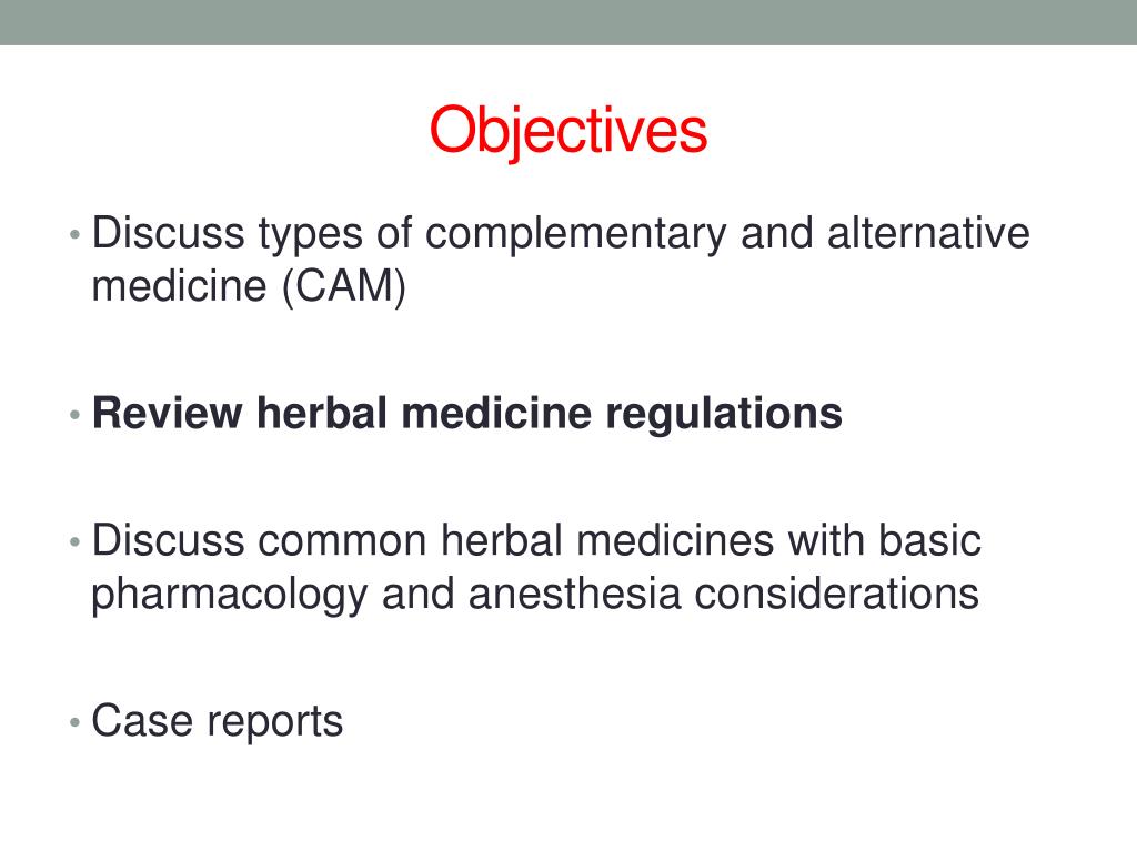Objectives • Discuss types of complementary and alternative medicine (CAM) • Review herbal medicine regulations • Discuss common herbal medicines with basic pharmacology and anesthesia implications • Case reports