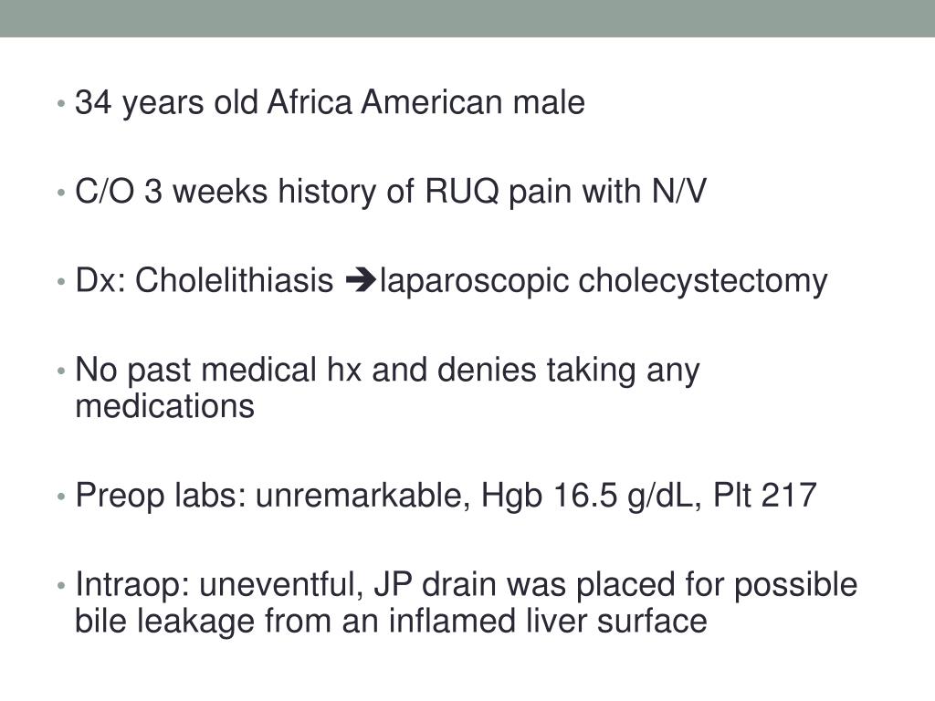 34 years old Africa American male • C/O 3 weeks history of RUQ pain with N/V • Dx: Cholelithiasislaparoscopic cholecystectomy • No past medical hx and denies taking any medications • Preop labs: unremarkable, Hgb 16.5 g/dL, Plt 217 • Intraop: uneventful, JP drain was placed for possible bile leakage from an inflamed liver surface