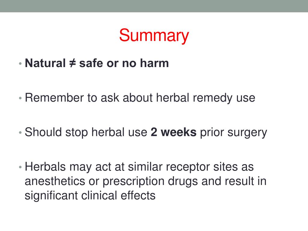 Summary • Natural ≠ safe or no harm • Remember to ask about herbal remedy use • Should stop herbal use 2 weeks prior surgery • Herbals may act at similar receptor sites as anesthetics or prescription drugs and result in significant clinical effects