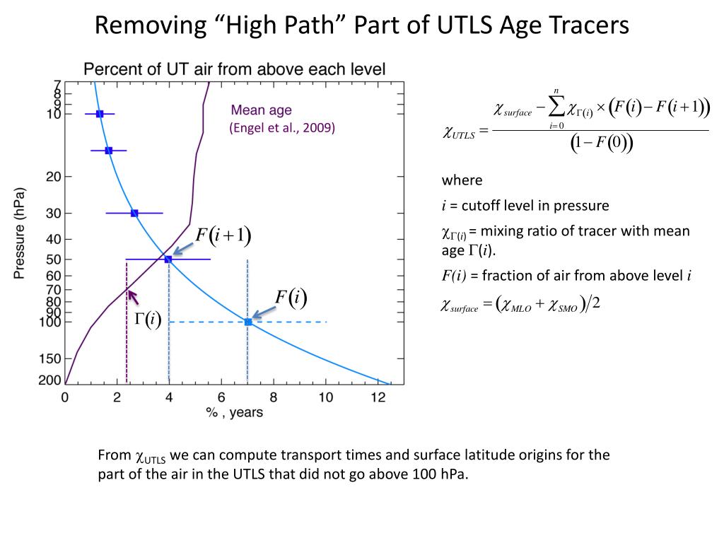 Removing “High Path” Part of UTLS Age Tracers (Engel et al., 2009) where i = cutoff level in pressure cG(i) = mixing ratio of tracer with mean age G(i). F(i) = fraction of air from above level i From cUTLS we can compute transport times and surface latitude origins for the part of the air in the UTLS that did not go above 100 hPa.