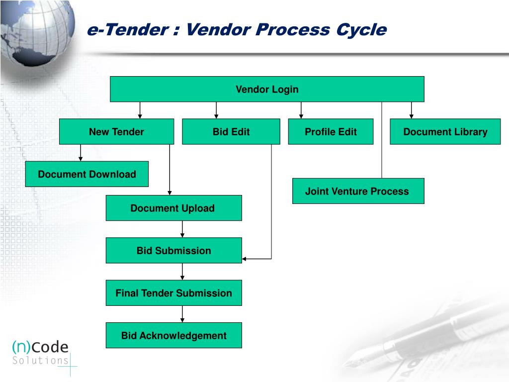 Vendor Login New Tender Bid Edit Profile Edit Document Library Document Download Joint Venture Process Document Upload Bid Submission Final Tender Submission Bid Acknowledgement e-Tender : Vendor Process Cycle