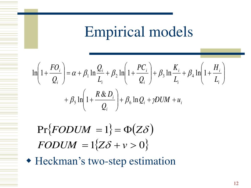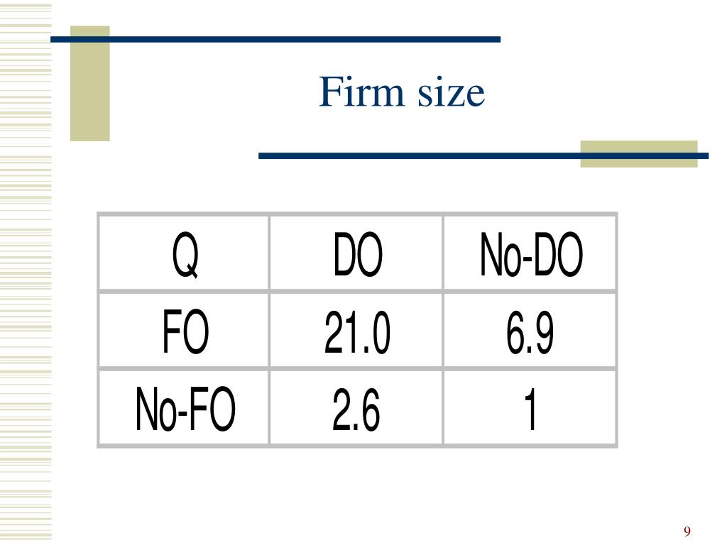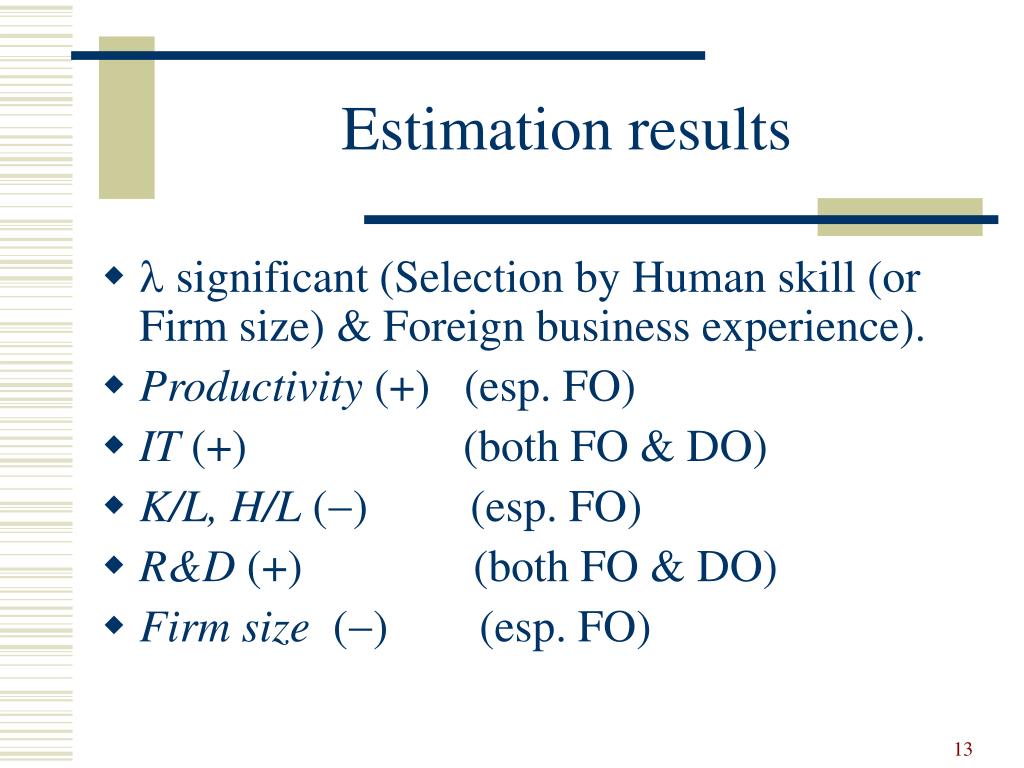 Estimation results • l significant (Selection by Human skill (or Firm size) & Foreign business experience). • Productivity (+) (esp. FO) • IT (+) (both FO & DO) • K/L, H/L (-) (esp. FO) • R&D (+) (both FO & DO) • Firm size (-) (esp. FO)